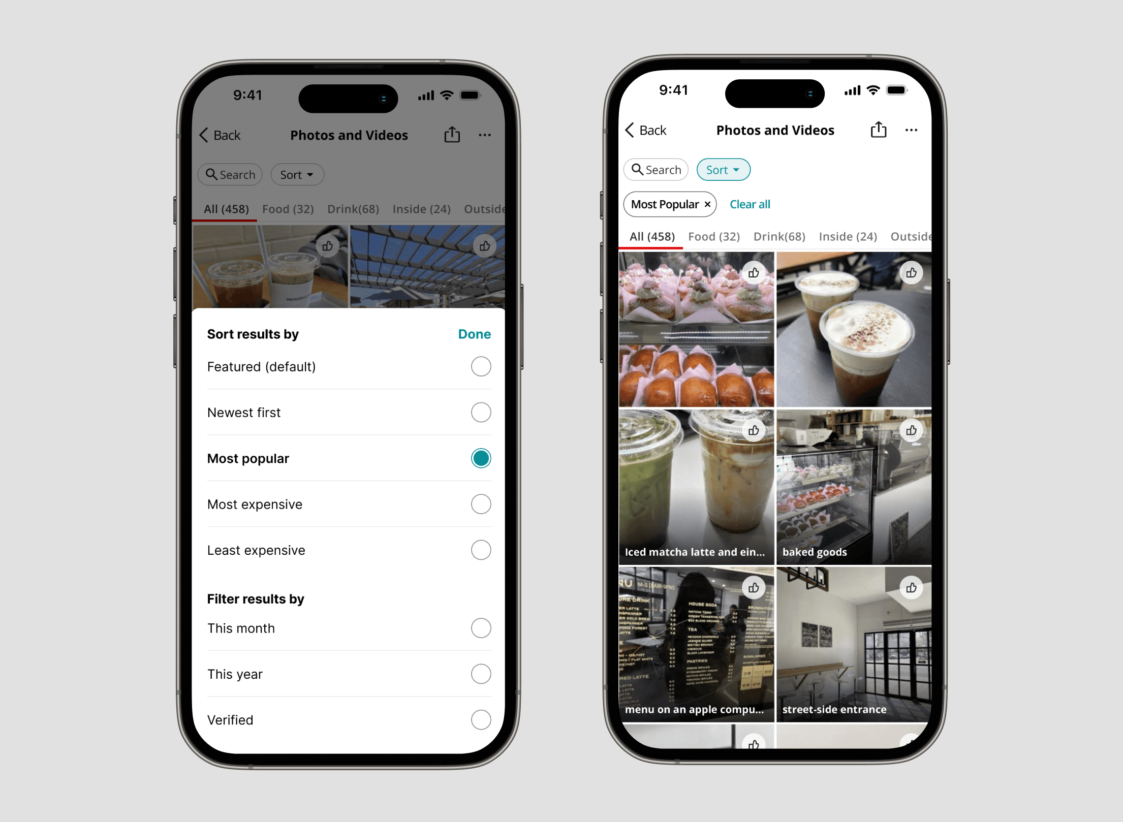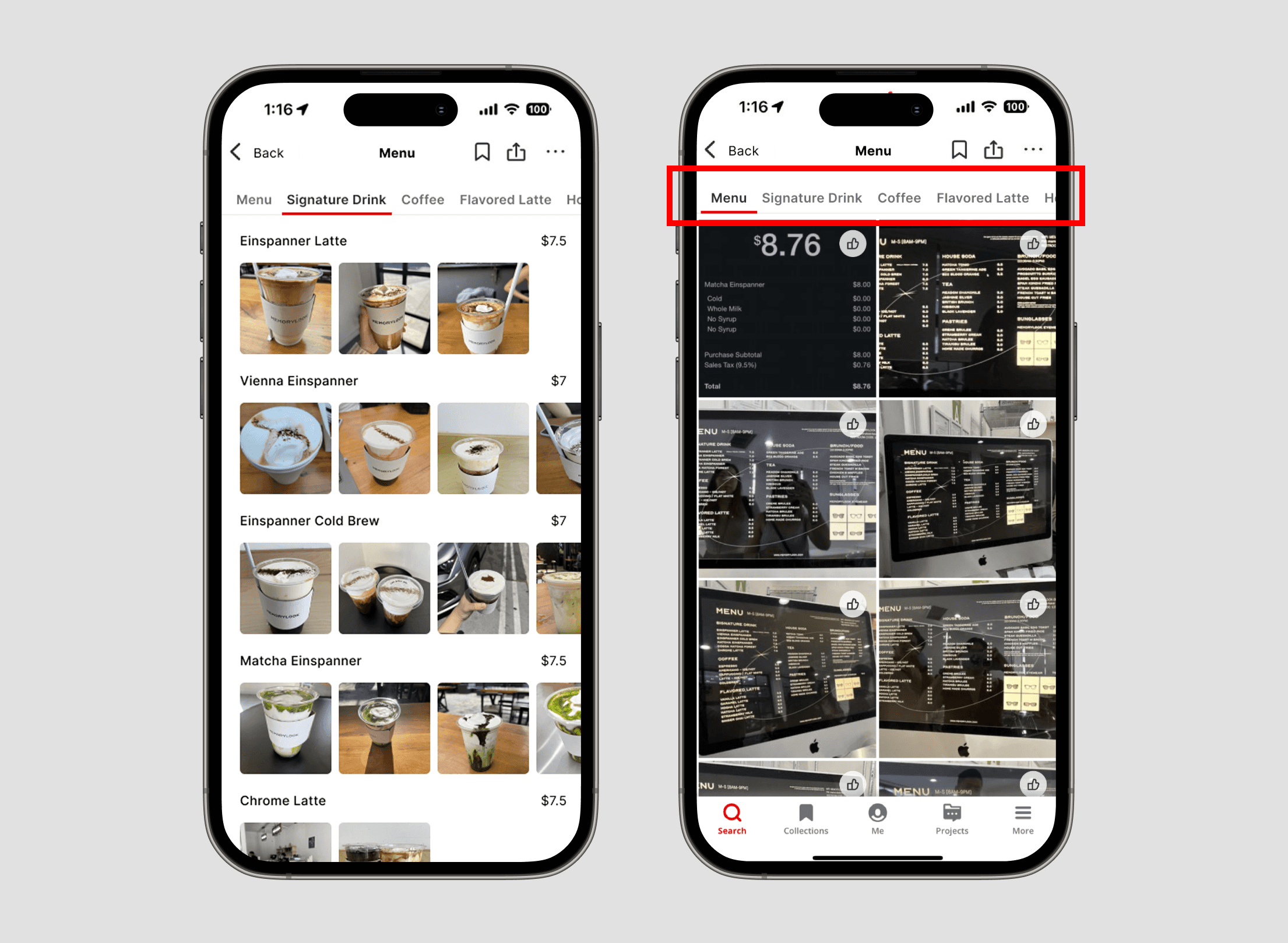 User feedback showed photos were still valued alongside the digital menu. We created two pathways: a structured menu for quick pricing and details, and a photo gallery of real customer images. This lets users choose between browsing through organized information or visual inspiration.
